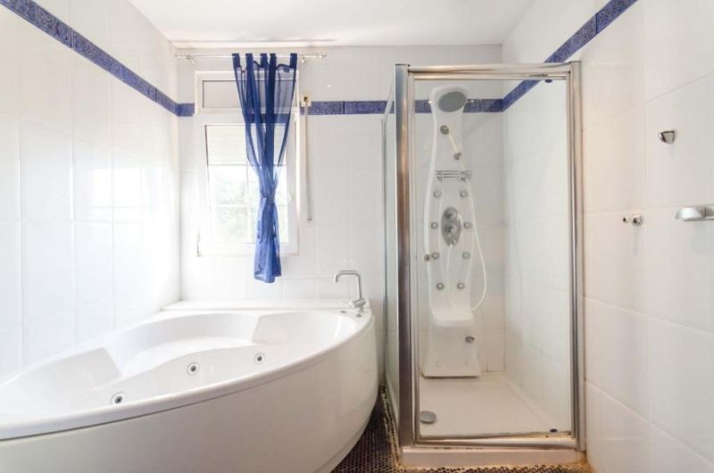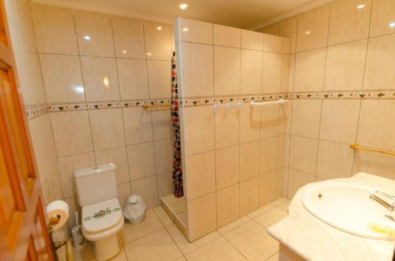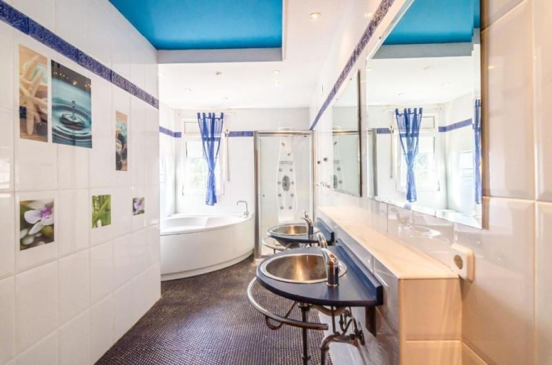 Спустившись по лестнице, вы увидите просторный сад с частным бассейном площадью 40 м2, еще две квартиры и спа-центр с финской сауной. Каждая квартира на первом этаже имеет отдельный вход, гостиную-столовую с кухней и ванную комнату. В одной квартире 3 спальни, в другой - две спальни.